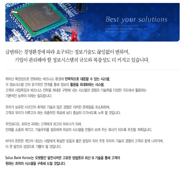 08376 서울특별시 구로구 디지털로31길 38-21 (구로동, 이앤씨벤처드림타워3차) 9F Solus Bank Korea Inc TEL:+82-2-6330-1100 FAX:+82-2-6330-1104